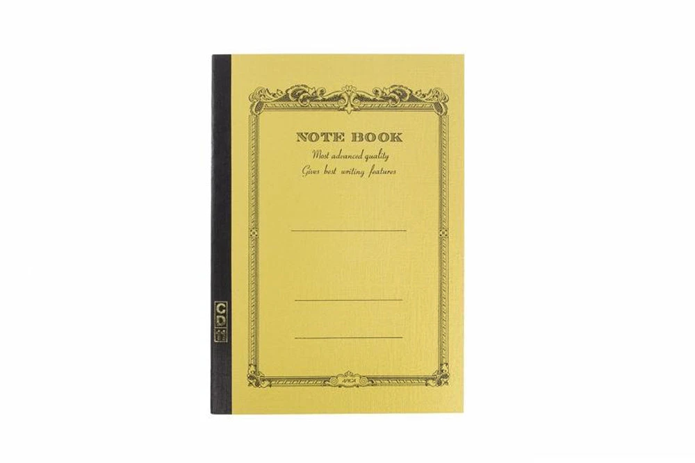 This A5-sized mustard yellow notebook features 28 sheets (56 pages) of white super-smooth ruled paper and reinforced stitched binding. Each sheet has 25 lines, spaced 7mm apart, with a blank margin at the top.