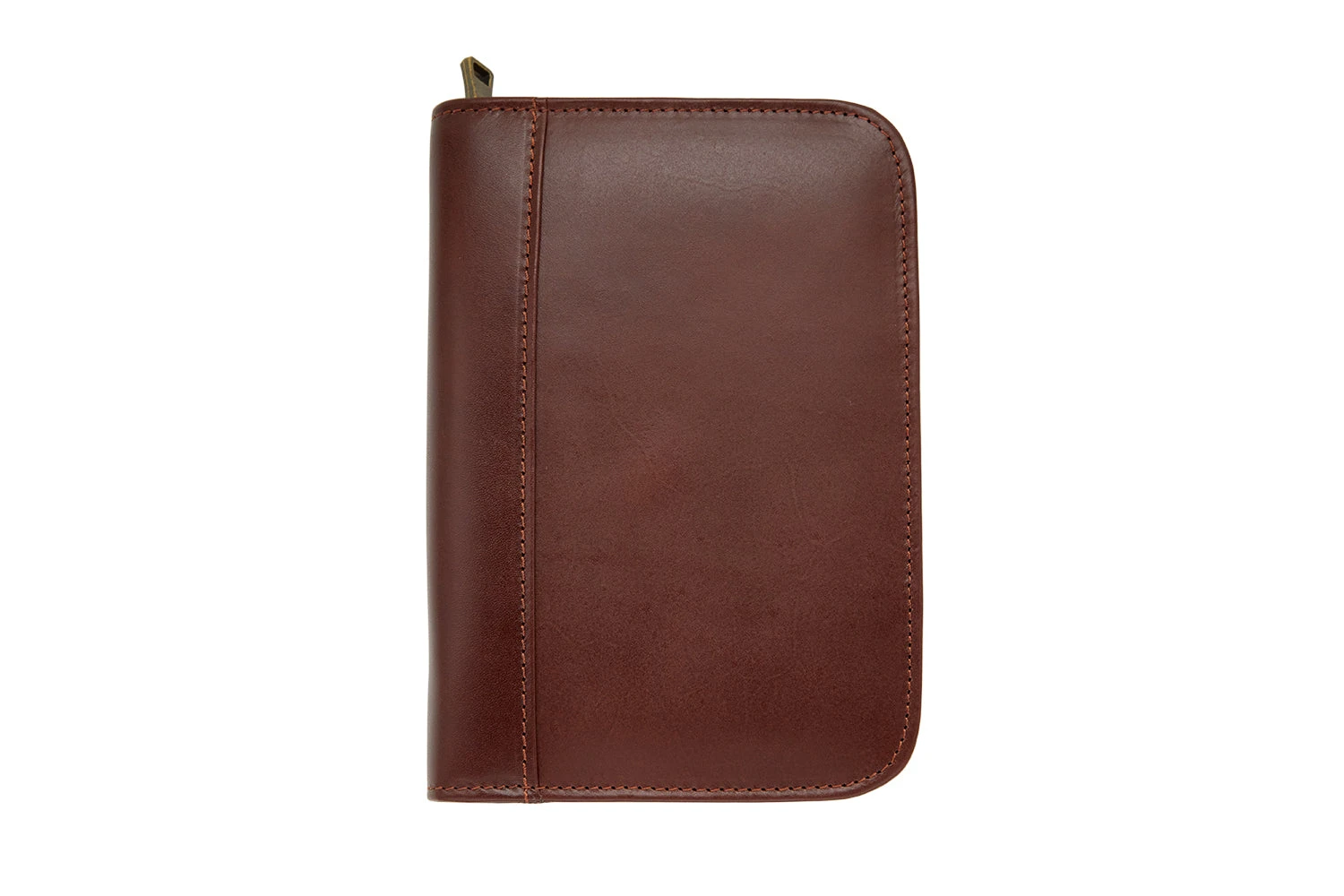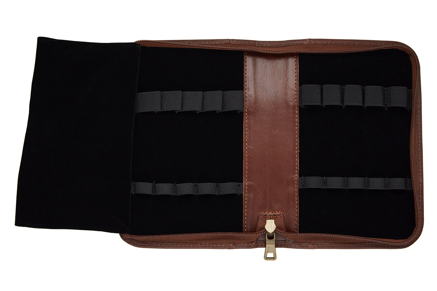 This medium brown Aston Leather zippered pen case has a black velvet lined interior and holds up to ten pens. Aston leathers are scratch resistant, supple and sturdy. They use only American made, water resistant cowhide leathers. These leathers are top grain, veg-tan (tanned with environmentally friendly oak tree oils) and become supple and more beautiful with age.