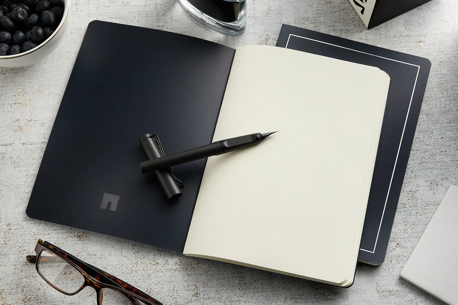 This A5-sized notebook features 48 sheets (96 pages) of blank ivory 90g Clairefontaine Triomphe paper. Both fountain pen and marker friendly, the paper is super smooth, acid-free, and pH neutral. The notebook has a sewn spine binding, yet also lays flat! The dark blue cover features silver stamping.