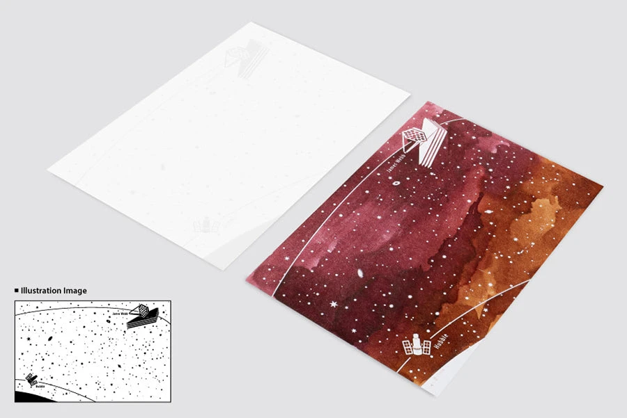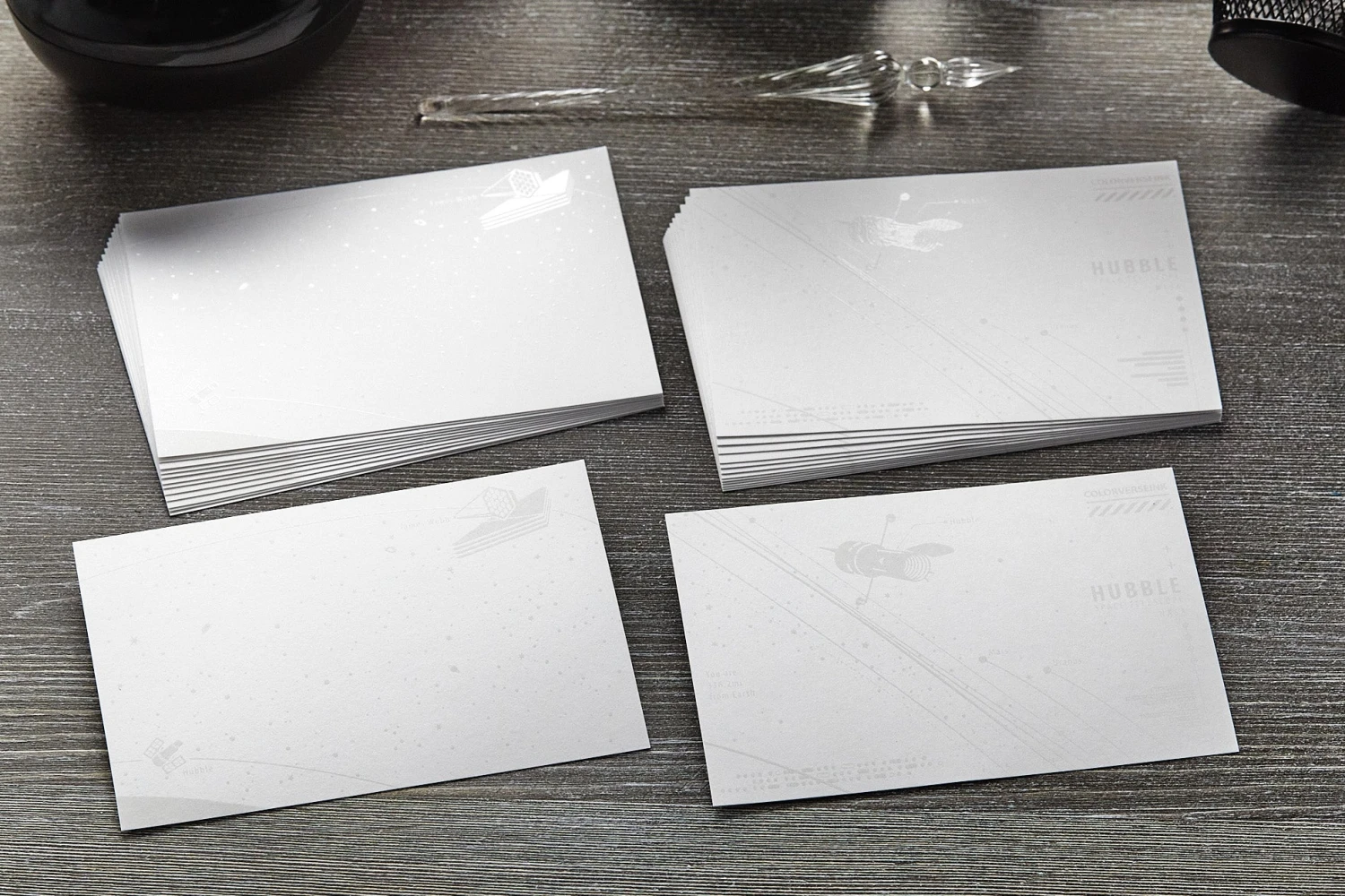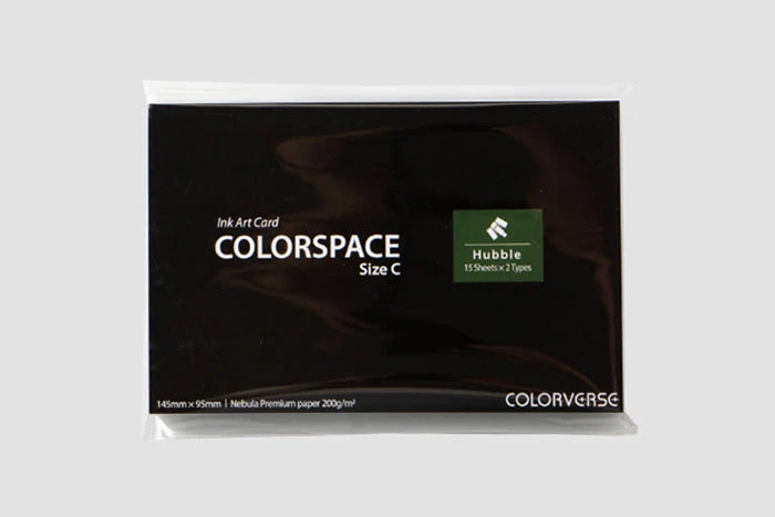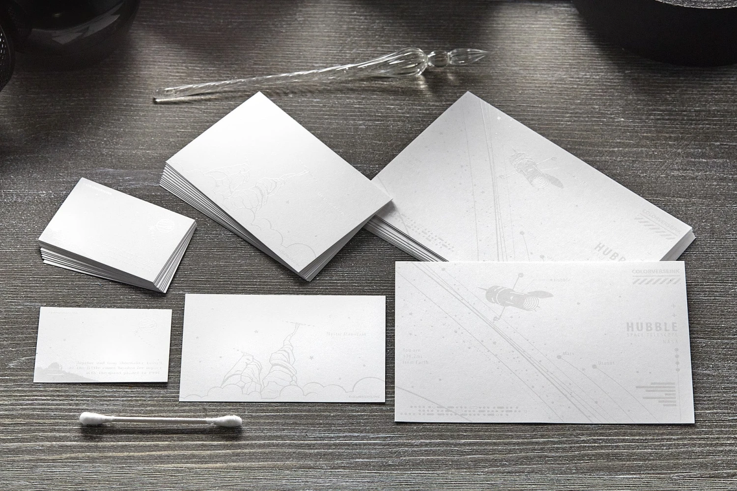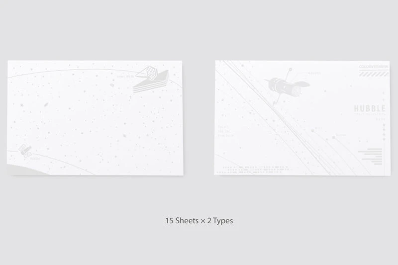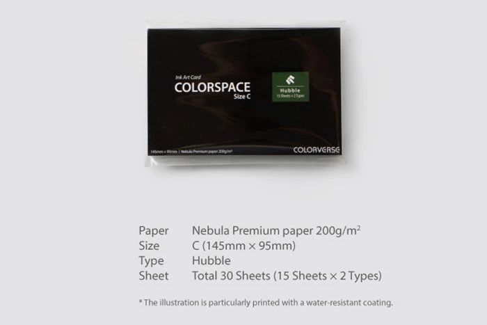Printed on Nebula Premium paper, this set contains 15 cards each of 2 different space-themed designs for a total of 30 cards. The paper, weighing in at 200g, is able to hold fountain pen ink without bleedthrough. The white illustrations are printed using a water-resistant finish, so they’ll be visible once the ink has been applied on top.