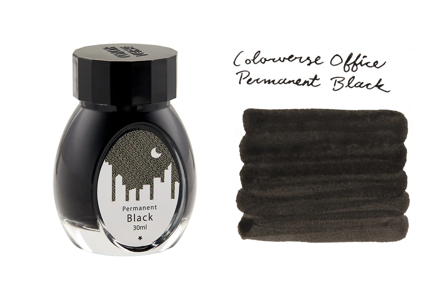 This black 30ml glass bottle of Colorverse Permanent Black fountain pen ink is designed to be used in the office or anywhere you need your ink to be permanent.