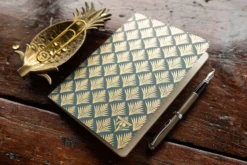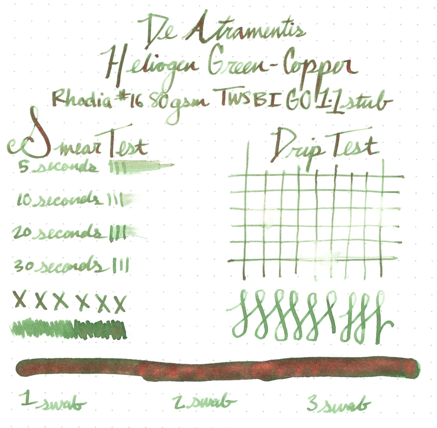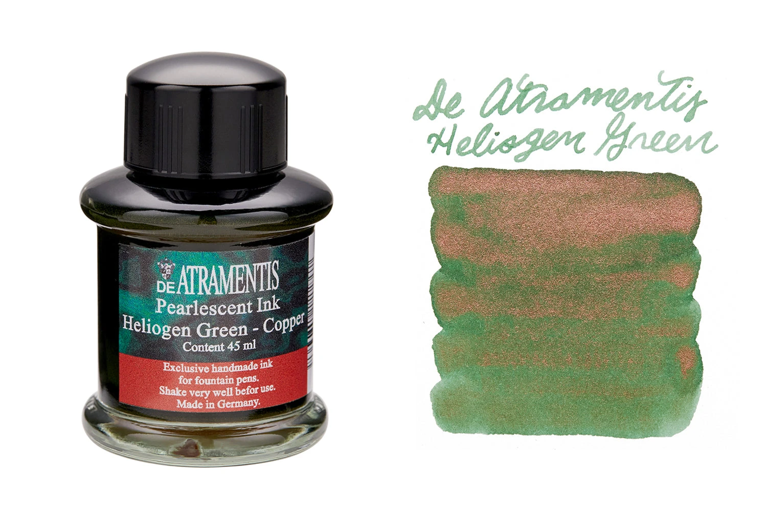 This green fountain pen ink features added copper pearlescent shimmer. Shimmering inks work best with broader nibs on high quality paper to really see the shine. De Atramentis fountain pen inks are exclusively handmade in Germany by Dr. Franz-Josef Jansen, and come in a 45ml glass bottle.