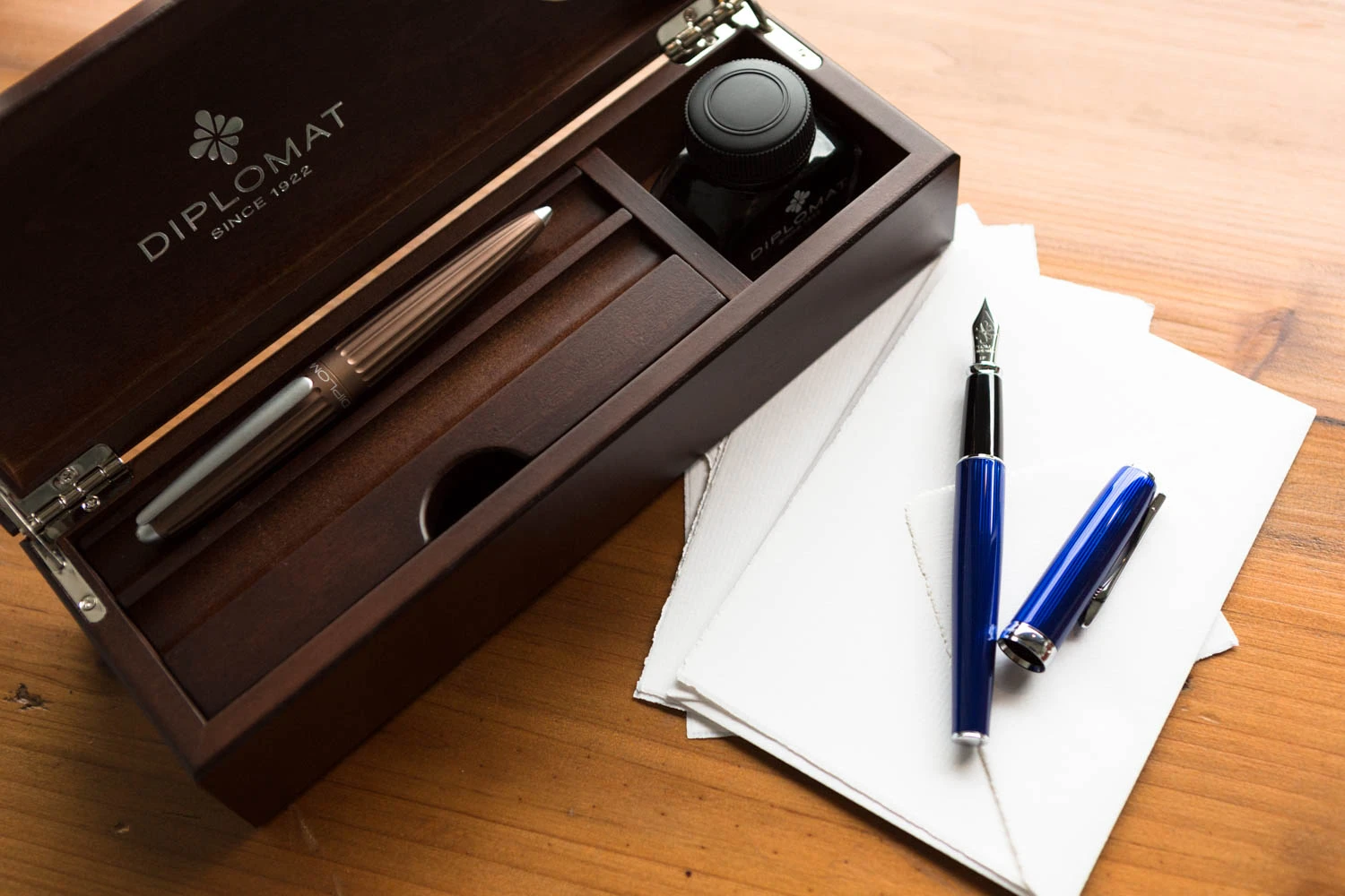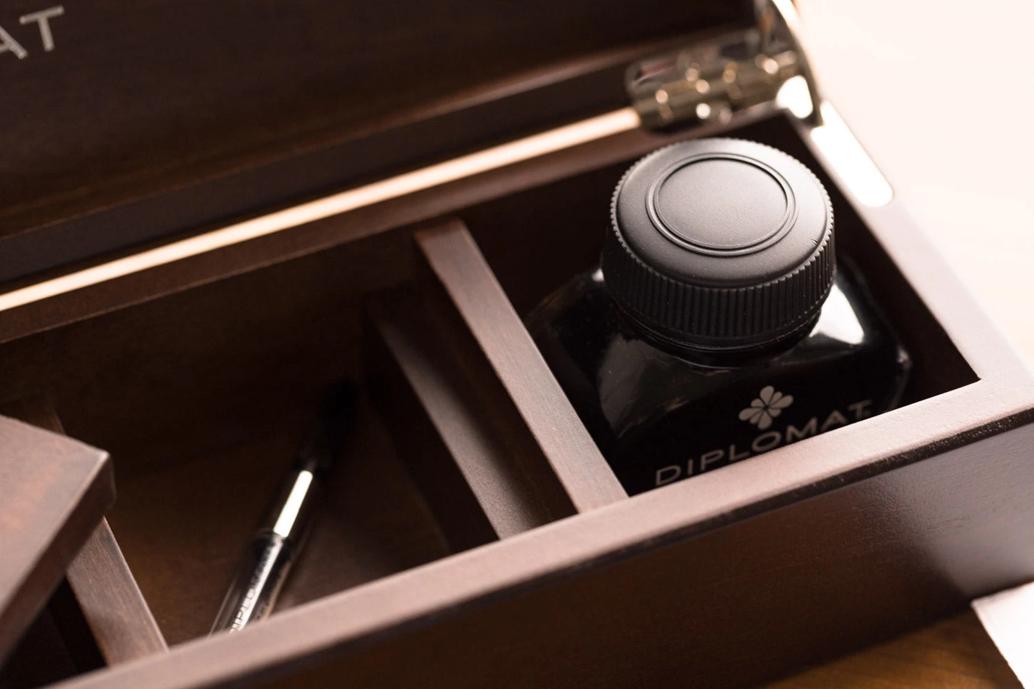 This dark wood pen holder is a must-have desk accessory. It accommodates a small bottle of blue ink (included!) and has a removable writing instrument tray with slots for up to two pens. Underneath this tray you’ll find an accessory compartment for spare converters, cartridges, etc.