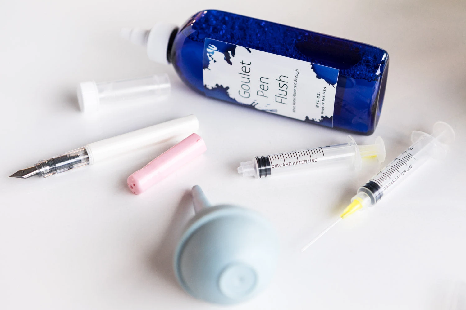 Everything you need to clean your fountain pens! Includes a 8oz bottle of our Goulet Pen Flush, empty vial for easy flush decanting, a bulb syringe, and our ink syringe set.