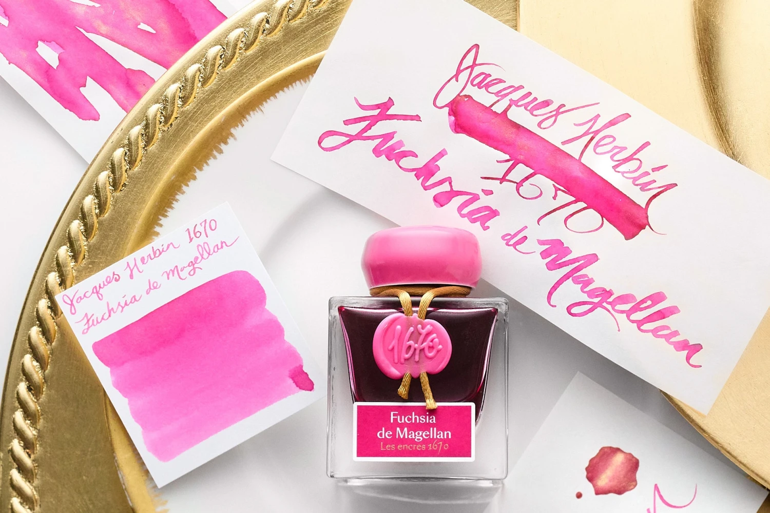 This 50ml glass bottle of 1670 Fuchsia de Magellan ink was first released in 2023 and contains a gold shimmer/sheen. Each bottle cap is hand dipped in sealing wax, with a stamped “1670” seal on the front of the bottle, and is individually packaged in a collector edition box.
