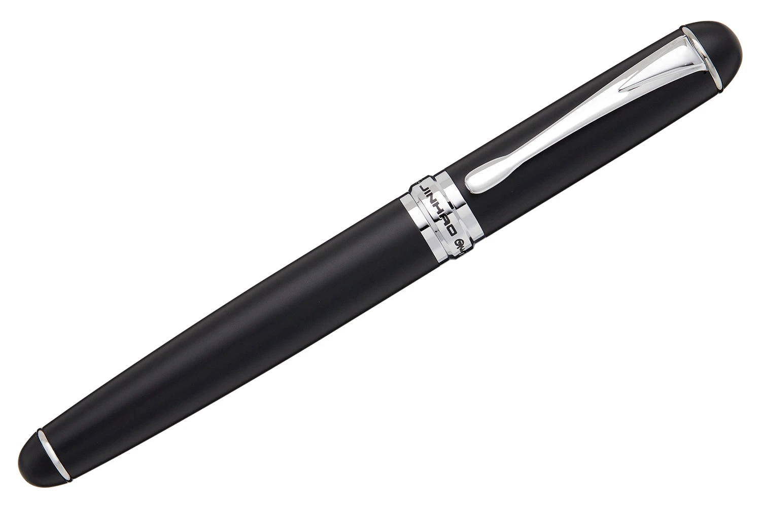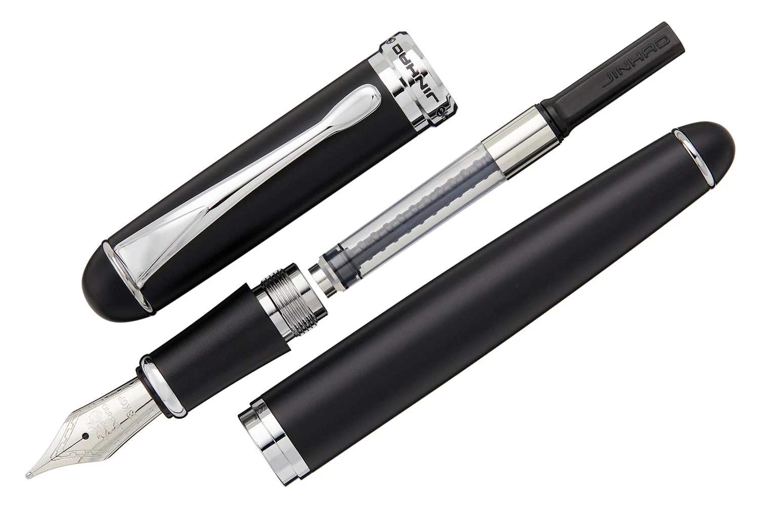 The Jinhao X750 fountain pen is made in China. It features a matte black metal body, chrome hardware, and a silver #6 steel nib. It comes with a converter, and also accepts standard international cartridges (not included).