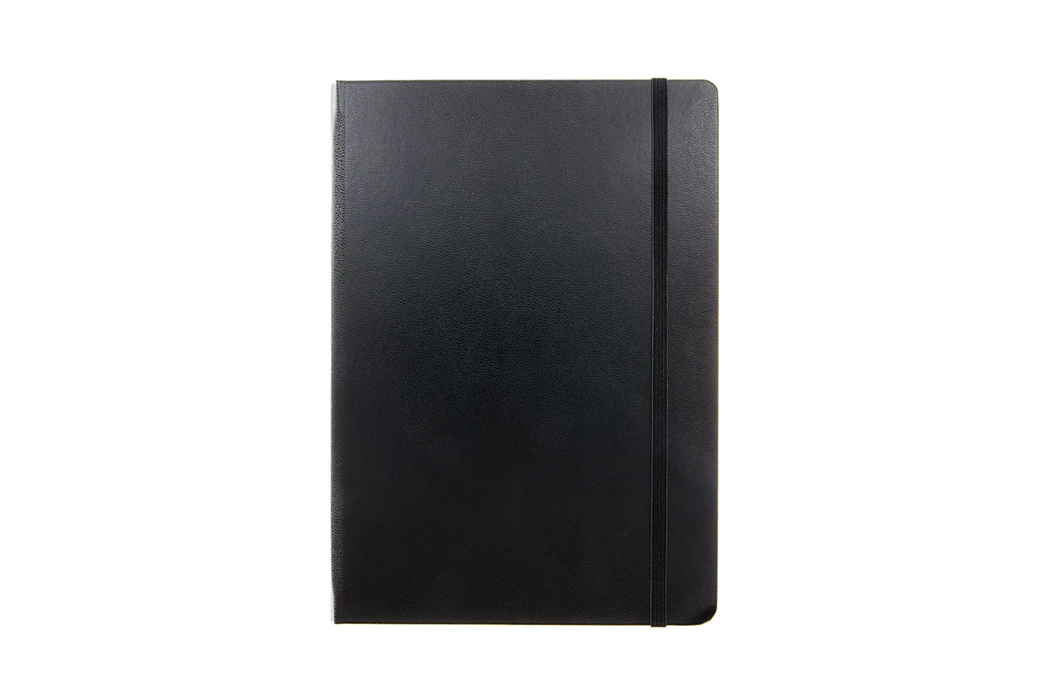 This medium A5-sized black Leuchtturm1917 hardcover notebook is equally suited for the desk and for use on the move. It contains 249 numbered pages (125 sheets) of 5mm dot grid 80g ivory paper. Features include an expandable pocket, a blank table of contents, two ribbon page markers, elastic band fastener, stickers for labeling/archiving, and it opens flat.