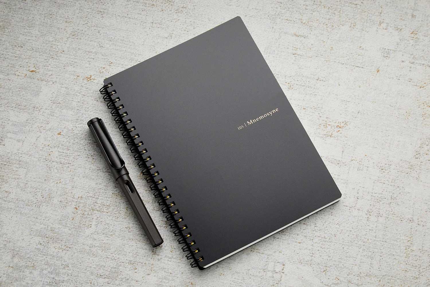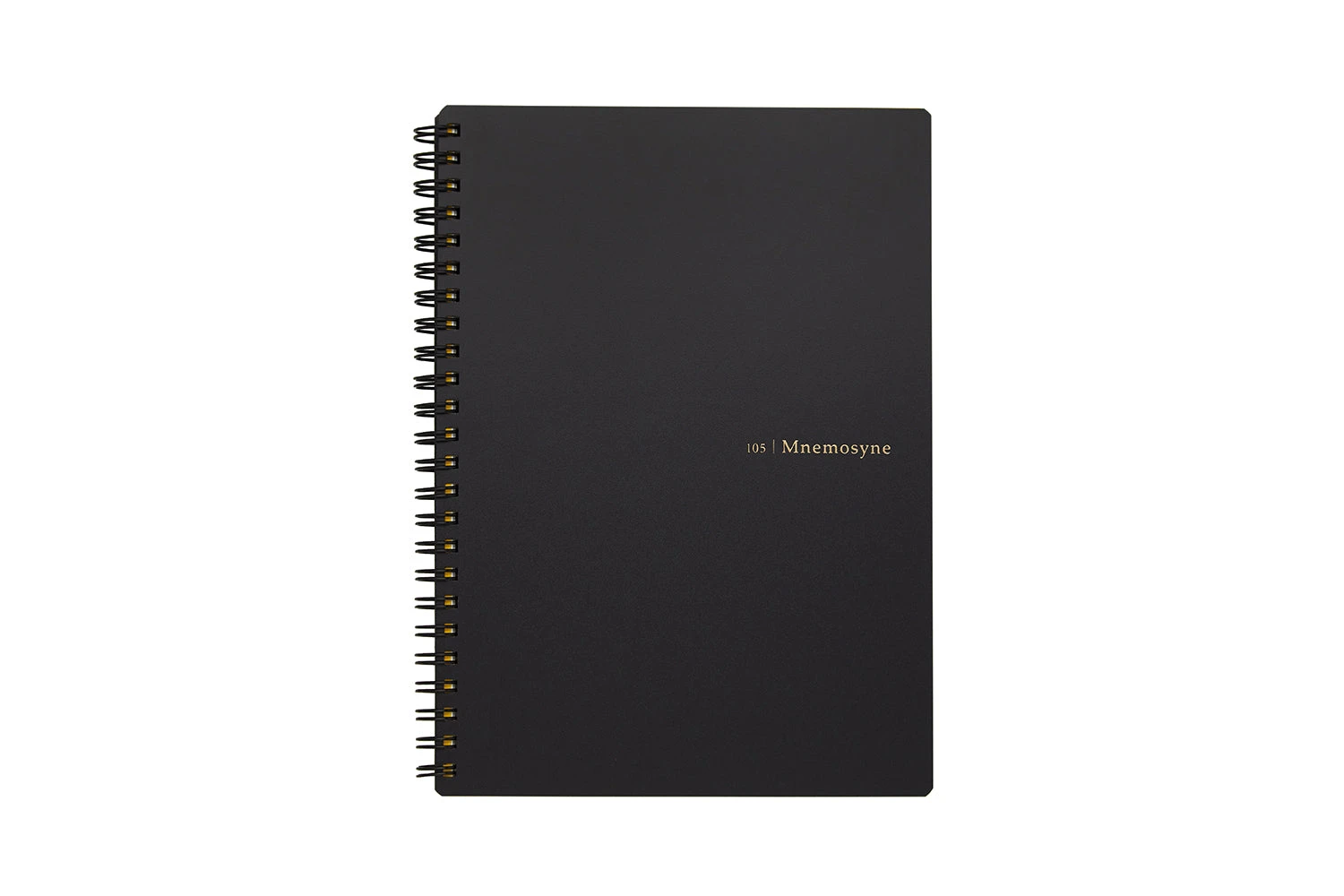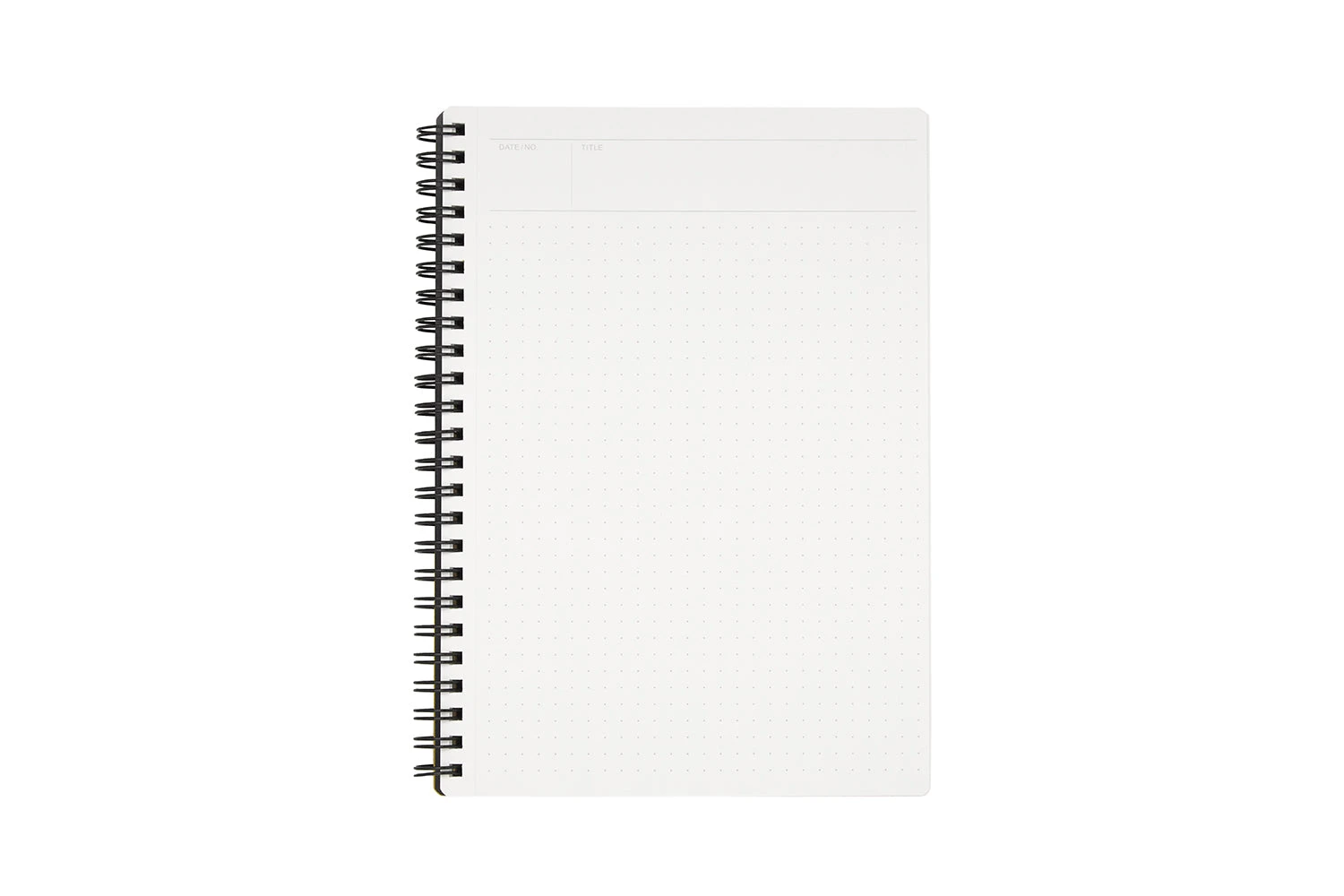 Made in Japan, this A5-sized notebook features 80 sheets of white acid-free 80gsm dot grid paper. The black double wire side spiral binding matches the black plastic cover. The notebook features dots spaced 5mm apart, and every page is micro-perforated. Each sheet contains a blank margin at the top with a space for the date and title.