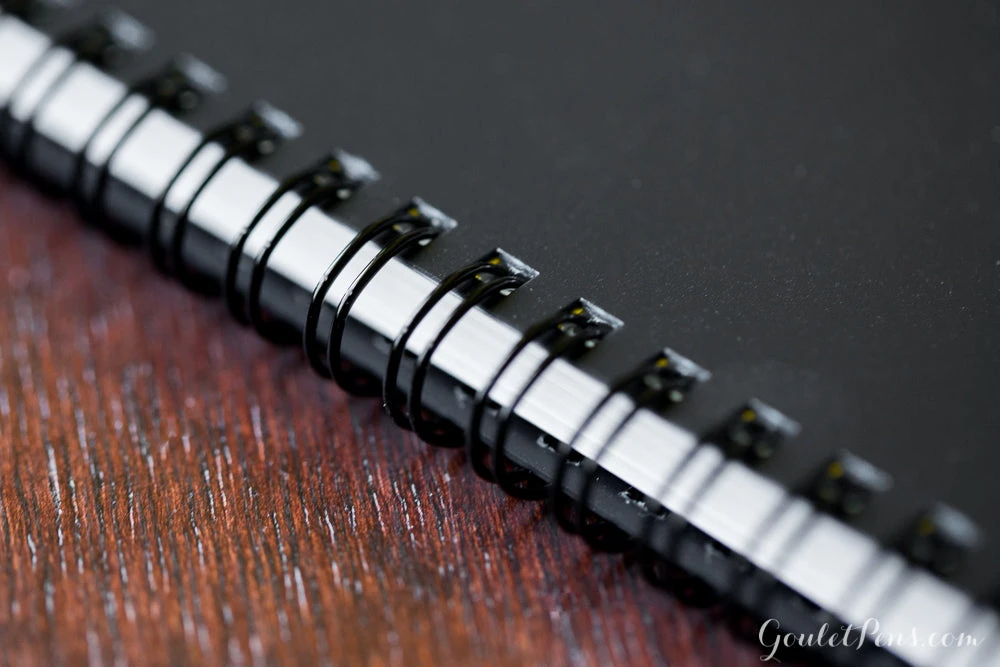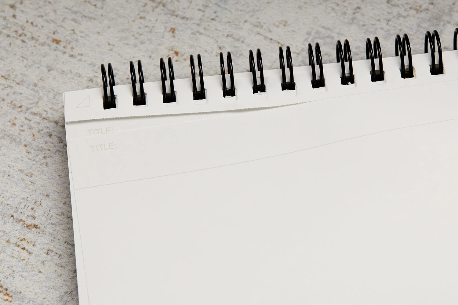Made in Japan, this horizontal A4-sized notebook features 70 sheets of white acid-free 80gsm blank paper. The black double wire top spiral binding matches the black plastic cover. The notebook features blank paper to allow you the freedom to capture all of your creative writing and sketches, and every page is micro-perforated. Each sheet contains a blank margin at the top with a space for the title and date.