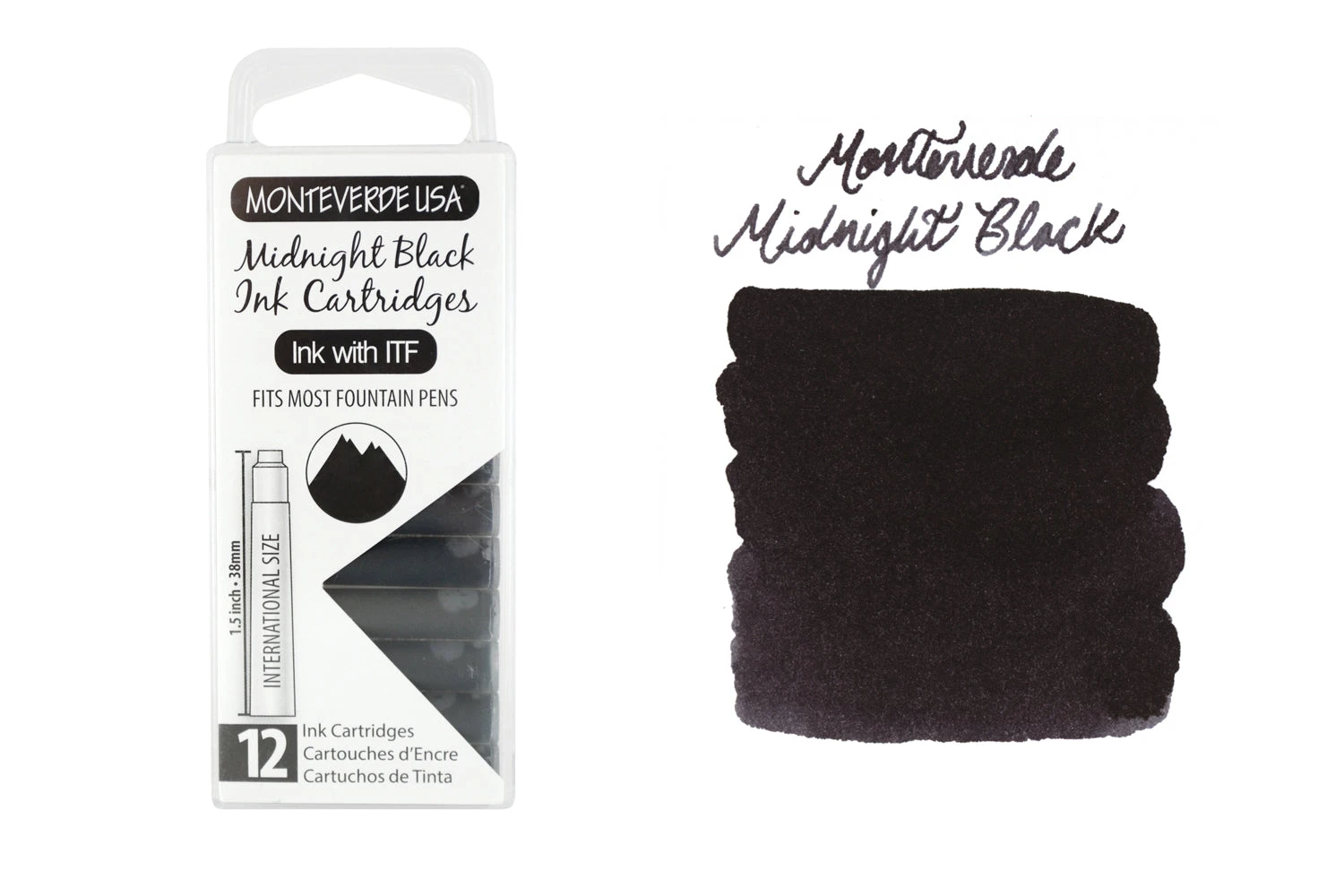 Packaged set of 12 Monteverde Midnight Black short standard international ink cartridges. These ink cartridges will fit all Monteverde cartridge/converter fountain pens, and any other pen that accepts the short standard international size.