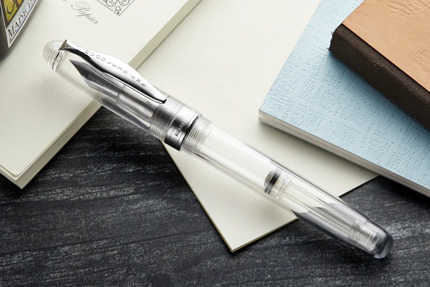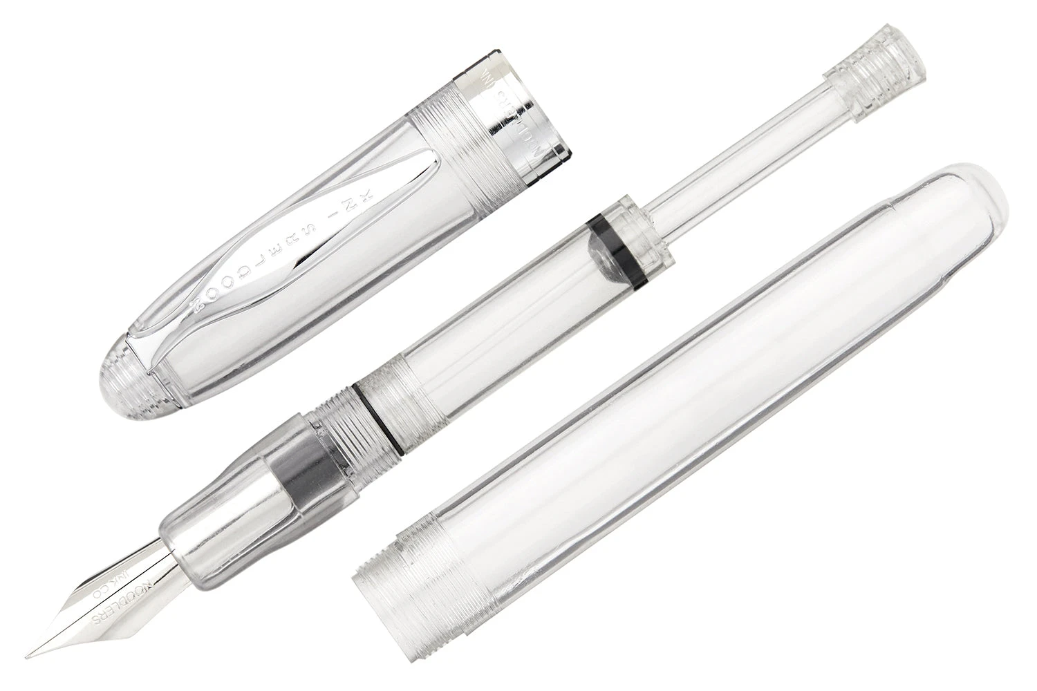 The Noodler’s Ahab flex pen features a steel flexible #6 nib and a slide piston mechanism. If you’d like, you can even remove the piston mechanism and use the pen as an eyedropper for a massive 6ml ink capacity. This clear demonstrator Ahab is made of a celluloid derivative and is technically biodegradable and formed from a “renewable resource”. The vegetal resin body of this pen may show particles or striations within the material. This is most noticeable in demonstrators and bright colors.