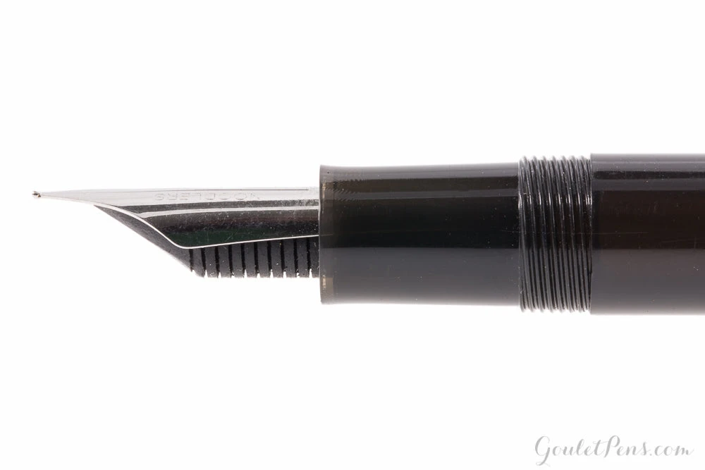 The Noodler’s Konrad flex pen is smaller than the Ahab, but larger than the Nib Creaper. This white and black fountain pen features a steel flexible nib and a twist piston mechanism with a blind cap. The Konrad is made of a celluloid derivative and is technically biodegradable and formed from a “renewable resource”. The vegetal resin body of this pen may show particles or striations within the material. This is most noticeable in demonstrators and bright colors.