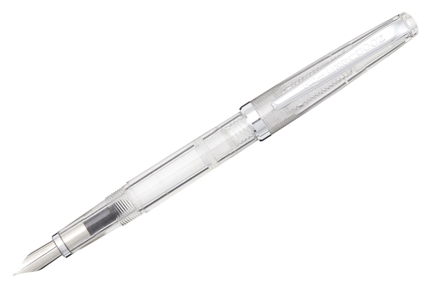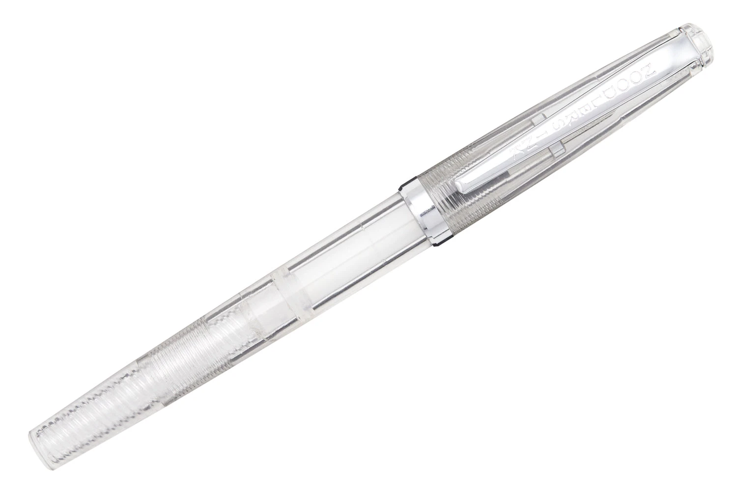 This clear Noodler’s Nib Creaper flex fountain pen features a small, slender body with a steel flexible #2 nib and a twist piston mechanism. A small ink window shows how much ink is left in your pen. These pens are made from a celluloid derivative. The vegetal resin body of this pen may show particles or striations within the material. This is most noticeable in demonstrators and bright colors.
