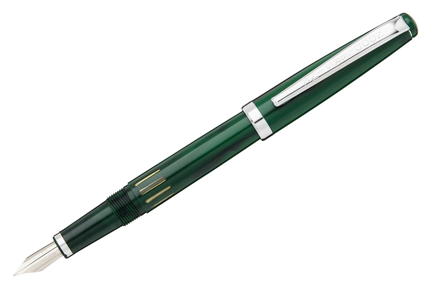 This green and black Noodler’s Nib Creaper flex fountain pen features a small, slender body with a steel flexible #2 nib and a twist piston mechanism. A small ink window shows how much ink is left in your pen. These pens are made from a celluloid derivative. The vegetal resin body of this pen may show particles or striations within the material. This is most noticeable in demonstrators and bright colors.