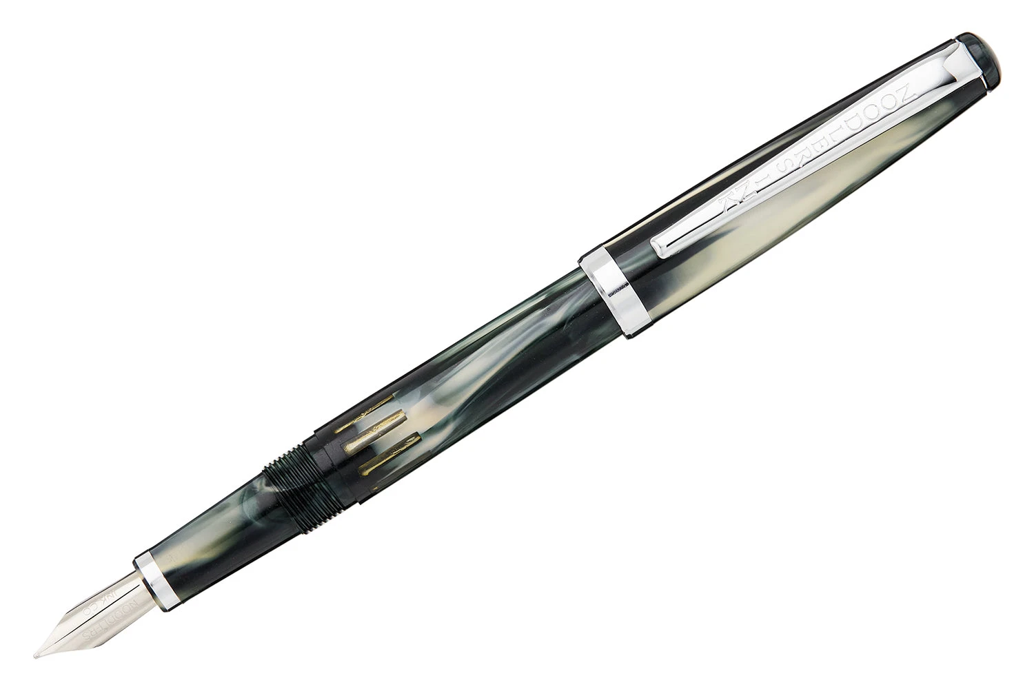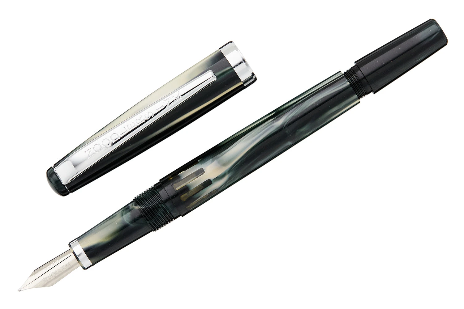 This white and black Noodler’s Nib Creaper flex fountain pen features a small, slender body with a steel flexible #2 nib and a twist piston mechanism. A small ink window shows how much ink is left in your pen. These pens are made from a celluloid derivative. The vegetal resin body of this pen may show particles or striations within the material. This is most noticeable in demonstrators and bright colors.
