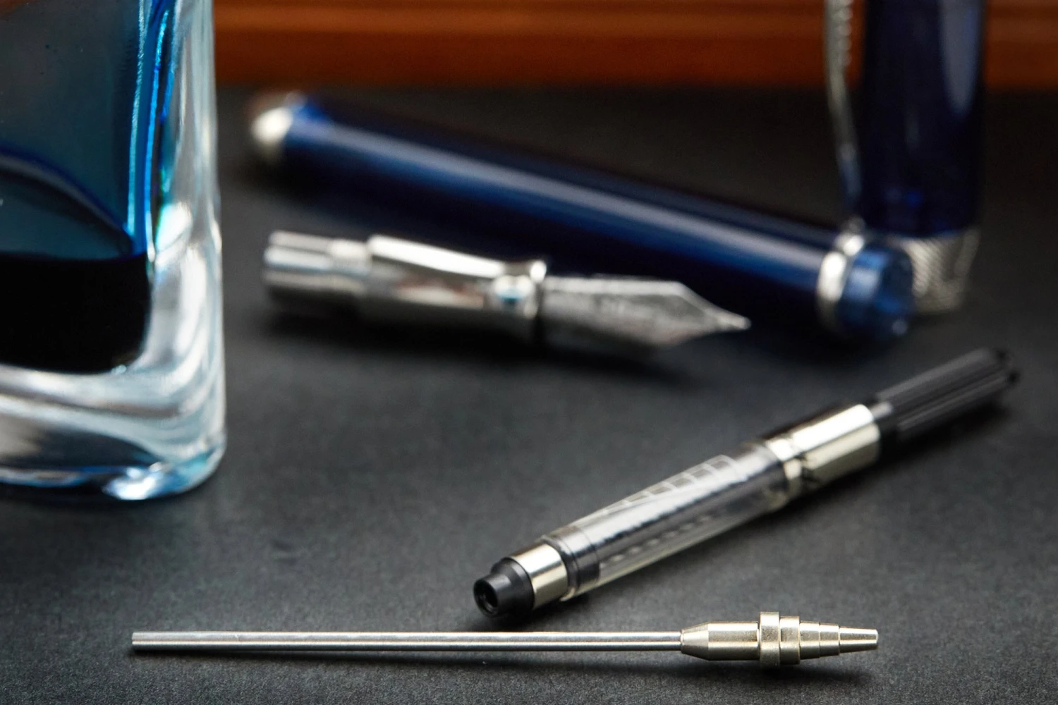 The easiest way to fill your converter and get every last drop! This Pineider Snorkel Filler is a stainless steel tube with an adapter that attaches to the end of your converter, allowing you to fill your converter directly from small bottles or from low volumes of ink.