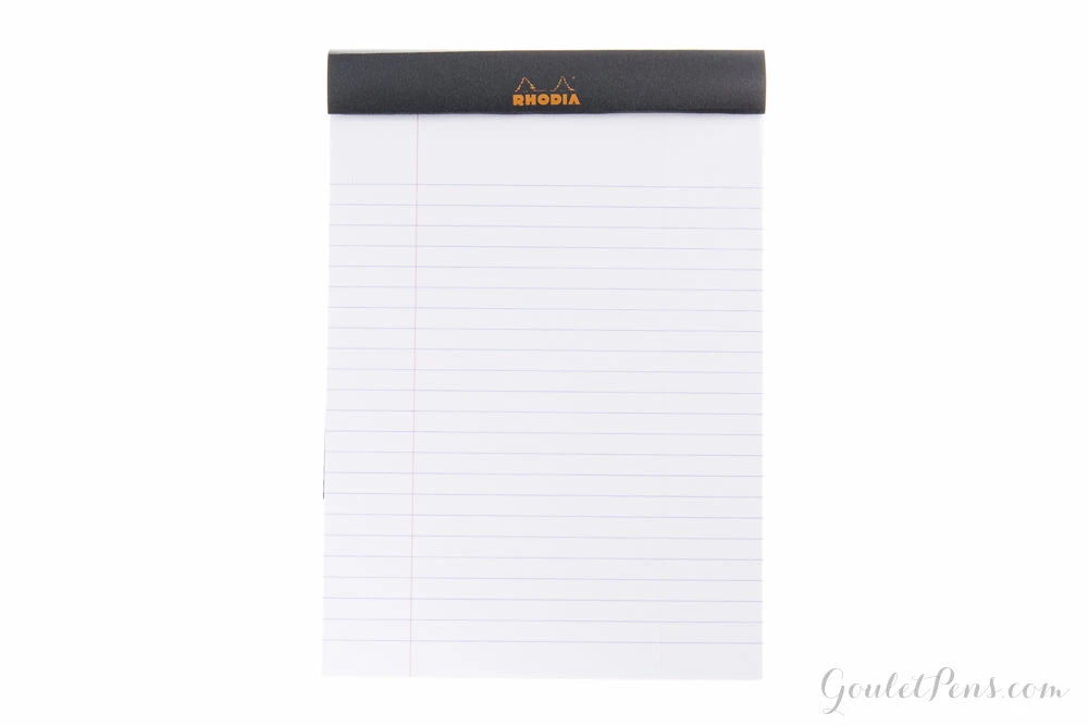 This A5-sized black Rhodia notepad features 80 sheets of extra white 80g acid-free, pH neutral ruled paper.Lines are spaced 7mm apart, and there is a red vertical margin line on the left. Each sheet is microperforated at the top for easy and clean removal. The top stapled cover folds back cleanly, and there is a hard cardboard back for writing support. These economical pads are a favorite of artists, designers, writers, and notebook fans for notes, sketching, and hand drafting. People love them for their smooth paper and iconic cover.