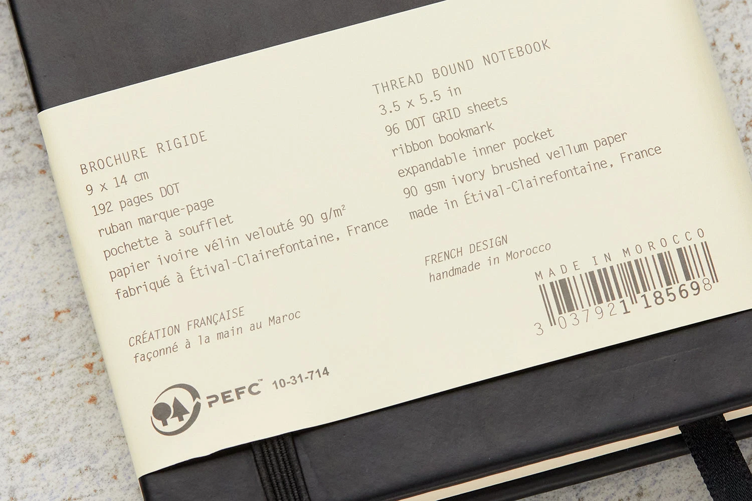 Known as the “Webbie”, the Rhodia Webnotebook is the choice for fountain pen users and everyday note taking. This pocket-sized notebook has a black leatherette hard cover. It is filled with 96 sheets (192 pages) of premium 90g ivory Clairefontaine 5mm dot grid paper. Other features include a ribbon marker, an elastic closure, an inner pocket for notes and cards, and elegant round corners.