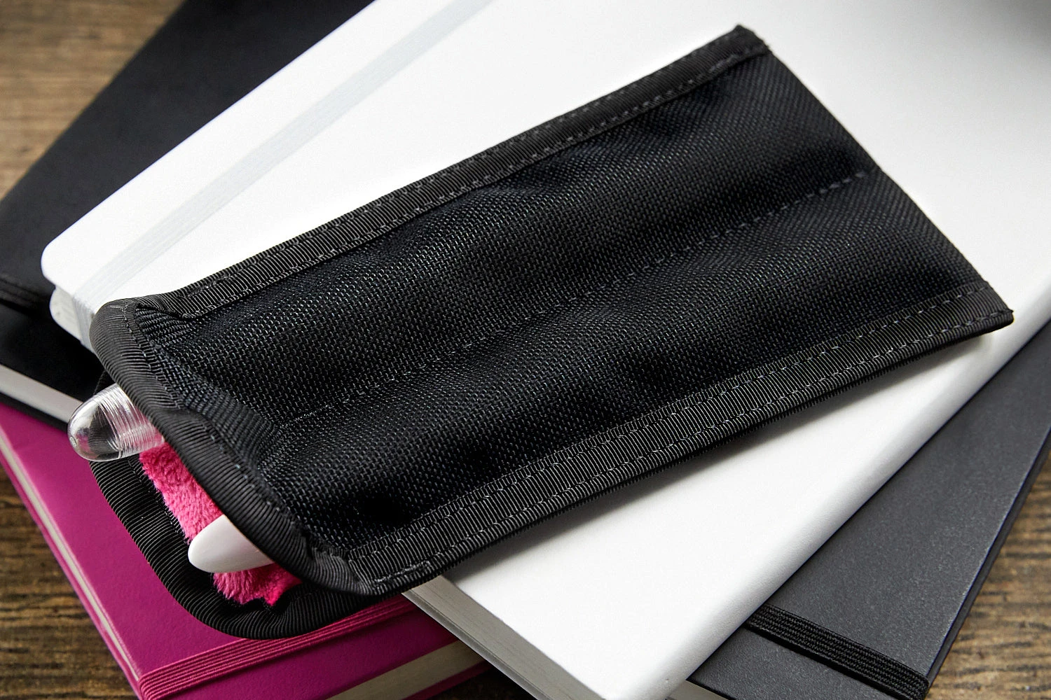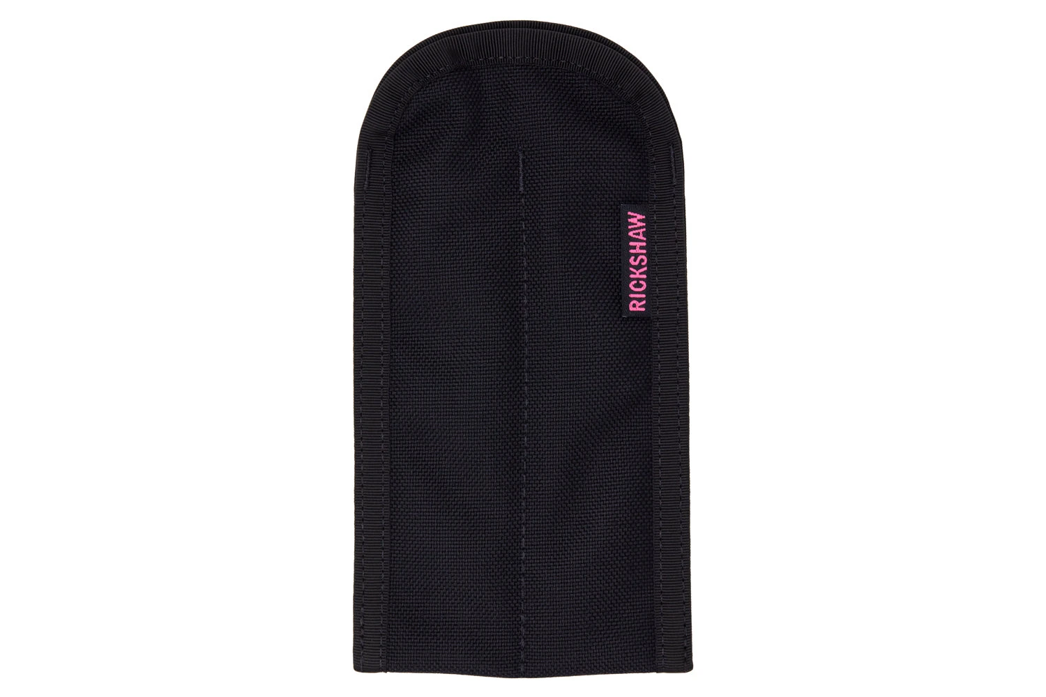 Protect your precious pens from the daily rough-and-tumble with these plush-lined sleeves. This Rickshaw Bagworks custom pen coozy features a solid black polyester canvas material, with a super-soft pink plush interior. This long pen coozy holds two pens.