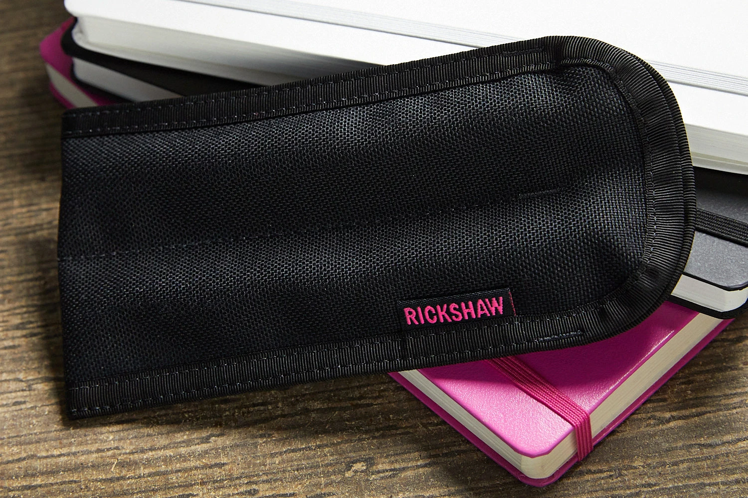 Rickshaw Bagworks pen sleeves are made in San Francisco. The exterior is Rickshaw’s DigiPrint™ polyester canvas, and the interior is Royal Plush™ polyester. Black nylon binding and thread. All materials are colorfast and machine washable.