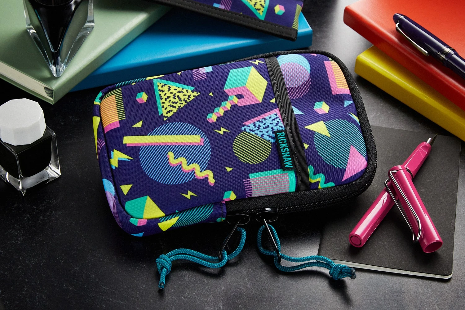 This Sinclair R is a Goulet Pens-exclusive design, featuring Rickshaw’s DigiPrint™ polyester canvas in a pattern we’ve called “Arcade Carpet” on the exterior. The interior is a peacock teal plush. All materials are colorfast and machine washable.