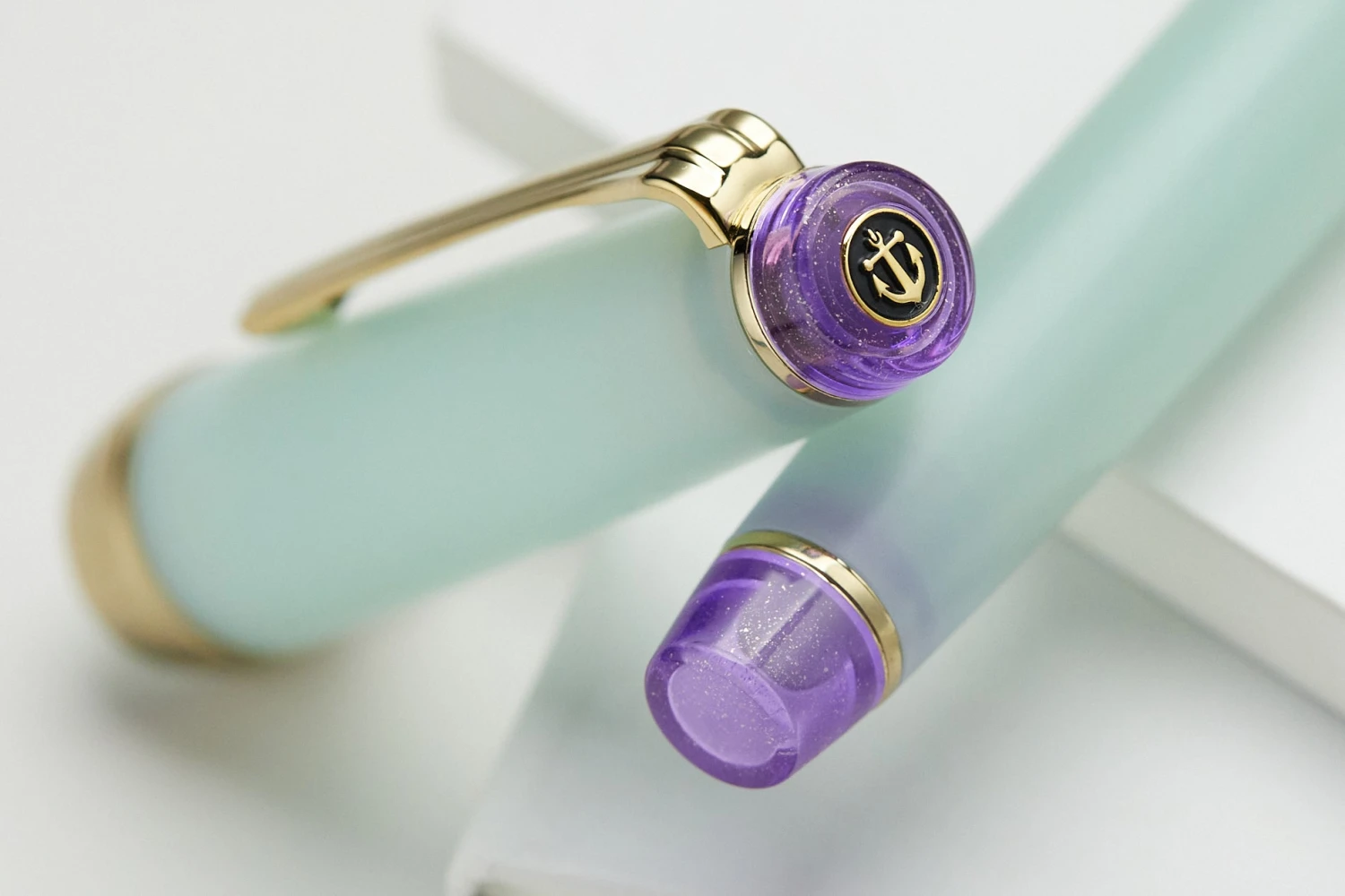 This Sailor Pro Gear Slim Spring Rain fountain pen features a translucent mint pastel green resin barrel and cap, complemented by gold-plated accents, and translucent glittering purple finials. The flat top cap features the Sailor anchor logo inset into the top finial. It comes equipped with Sailor’s legendary 21k bicolor gold nib in medium fine. The cap screws to open/close and can push to post onto the back of the barrel when writing. The Professional Gear Slim fountain pen comes with a Sailor proprietary converter as well as two proprietary Sailor Black ink cartridges.