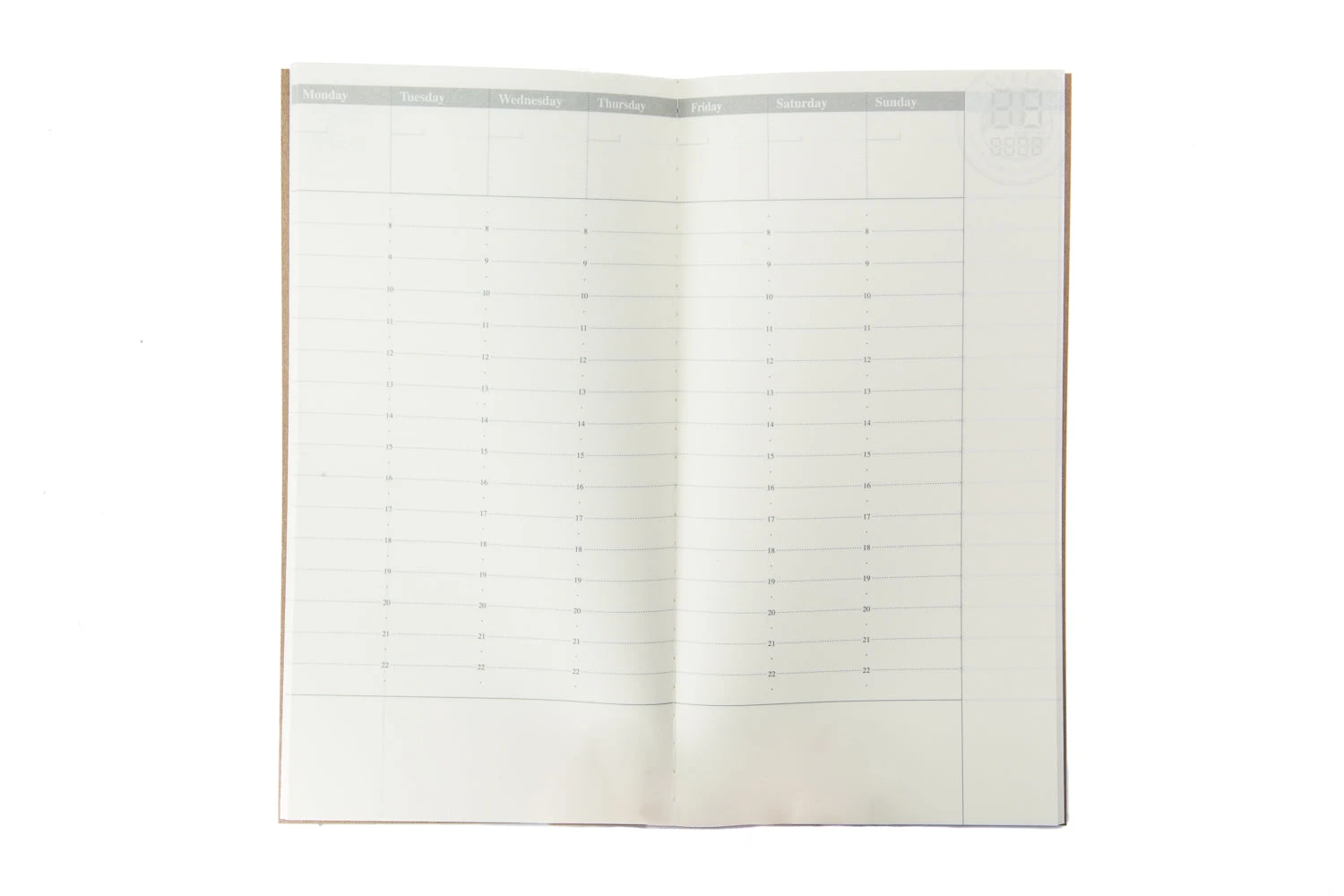 This refill for the regular size Traveler’s Notebook measures 11cm x 21cm (approximately 4.33in x 8.25in), and contains 32 sheets (64 pages) of ivory fountain pen friendly Midori MD paper. Binding is stitched. A diary in weekly format without dates. You can begin using it in any month you want. A single bundle contains 6 months of weekly pages. Just customize and use it like you want to. Weekly pages (for 28 weeks, half a year), monthly pages: 64 pages in total.